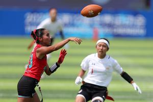 (250814) -- CHENGDU, 14 agosto, 2025 (Xinhua) -- Diana Flores (i), de México, compite durante el partido del grupo B de la ronda preliminar femenina de fútbol bandera entre México y Japón en los Juegos Mundiales 2025, en Chengdu, en la provincia de Sichuan, en el suroeste de China, el 14 de agosto de 2025. (Xinhua/Chen Bin) (rtg) (ra) (ce)