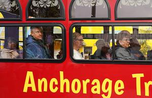 (250814) -- ANCHORAGE, 14 agosto, 2025 (Xinhua) -- Personas toman un autobús turístico, en Anchorage, Alaska, Estados Unidos, el 14...
