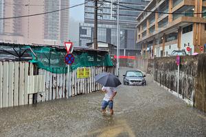 (250814) -- MACAO, 14 agosto, 2025 (Xinhua) -- Imagen del 14 de agosto de 2025 de una calle inundada en...