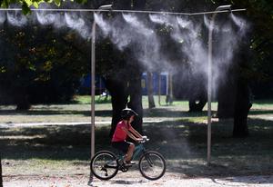(250814) -- VIENA, 14 agosto, 2025 (Xinhua) -- Un niño monta una bicicleta bajo un sistema de enfriamiento por rocío...