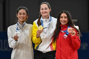 (250814) -- CHENGDU, 14 agosto, 2025 (Xinhua) -- La medallista de oro Fran Vanhoutte (c), de Bélgica, la medallista de...