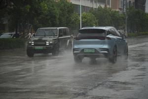 (250814) -- GUANGZHOU, 14 agosto, 2025 (Xinhua) -- Automóviles circulan bajo la lluvia en una calle, en el poblado de...