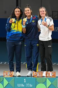 (250814) -- CHENGDU, 14 agosto, 2025 (Xinhua) -- Las medallistas de oro, Gabriela Rueda (c), de Colombia, y Gabriela Vargas...