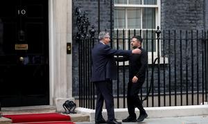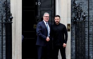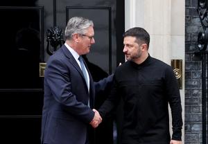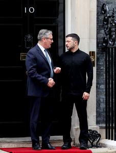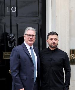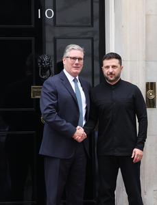 (250814) -- LONDRES, 14 agosto, 2025 (Xinhua) -- El primer ministro británico, Keir Starmer (i), recibe al presidente ucraniano, Volodymyr...