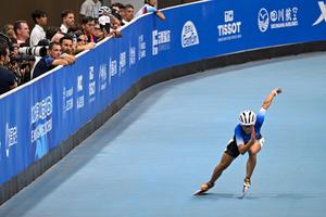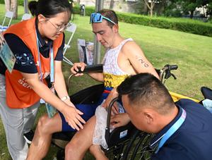 (250814) -- CHENGDU, 14 agosto, 2025 (Xinhua) -- Brian Moya (c), de Colombia, recibe tratamiento médico durante la final individual...
