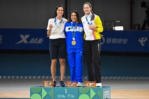 (250814) -- CHENGDU, 14 agosto, 2025 (Xinhua) -- La medallista de oro, Ivonne Saraí Nóchez Gallardo (c), de El Salvador,...
