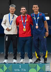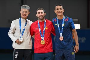 (250814) -- CHENGDU, 14 agosto, 2025 (Xinhua) -- El medallista de oro, Jhoan Sebastián Guzmán Bitar (c), de España, el...