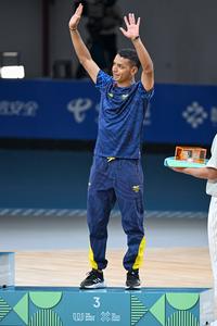(250814) -- CHENGDU, 14 agosto, 2025 (Xinhua) -- El medallista de bronce, Jhon Edwar Tascón Holguín, de Colombia, saluda a...