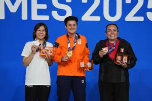 (250815) -- CHENGDU, 15 agosto, 2025 (Xinhua) -- Imagen del 14 de agosto de 2025 de la medallista de oro Therese Klompenhouwer (c), de Países Bajos, la medallista de plata Miyashita Ayaka (i), de Japón, y la medallista de bronce, Jackeline Pérez, de Perú, posando durante la ceremonia de premiación de carambola de tres bandas femenino del evento de billar en los Juegos Mundiales 2025, en Chengdu, en la provincia de Sichuan, en el suroeste de China. (Xinhua/Xu Bingjie) (oa) (ra) (vf)