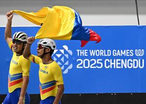 (250815) -- CHENGDU, 15 agosto, 2025 (Xinhua) -- Jhon Edwar Tascón Holguín (d), de Colombia, que finalizó en segundo lugar, festeja con su compañero de equipo Juan Jacobo Mantilla Pinilla, quien posteriormente fue descalificado, al término de la final de esprint masculino 1000 m de patinaje de velocidad en línea en pista en los Juegos Mundiales 2025, en Chengdu, en la provincia de Sichuan, en el suroeste de China, el 15 de agosto de 2025. (Xinhua/Xie Jianfei) (jg) (rtg) (vf)