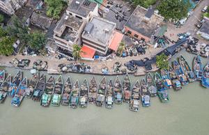 (250816) — HAIKOU, 16 agosto, 2025 (Xinhua) — Vista aérea tomada con un dron el 16 de agosto de 2025 de buques pesqueros temporalmente retrasados en su salida debido a una depresión tropical, en un puerto, en Haikou, en la provincia de Hainan, en el sur de China. Para garantizar la seguridad en medio de una depresión tropical en curso, el Departamento Provincial de Agricultura y Asuntos Rurales de Hainan emitió un aviso instando a los pescadores a suspender temporalmente las actividades pesqueras y a mantener sus barcos resguardados de forma segura en el puerto. (Xinhua/Pu Xiaoxu) (oa) (ra) (ce)