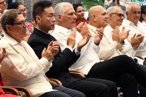 (250815) -- LA HABANA, 15 agosto, 2025 (Xinhua) -- Imagen del 14 de agosto de 2025 del presidente cubano, Miguel Díaz-Canel (3-i-frente), y el embajador chino en Cuba, Hua Xin (2-i-frente), participando en un acto en conmemoración del 80° aniversario de la victoria de China contra la agresión japonesa, en el Palacio de la Revolución, sede del gobierno cubano, en La Habana, capital de Cuba. Las principales autoridades de Cuba, encabezadas por el presidente del país, Miguel Díaz-Canel, asistieron el jueves a la conmemoración del 80° aniversario de la victoria en la Guerra de Resistencia del Pueblo Chino contra la Agresión Japonesa (1931-1945) y la Guerra Antifascista Mundial. (Xinhua/Joaquín Hernández) (jh) (jg) (rtg) (vf)