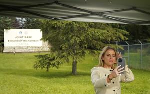 (250815) -- ANCHORAGE, 15 agosto, 2025 (Xinhua) -- Imagen del 14 de agosto de 2025 de una periodista preparándose para trabajar frente al letrero de la Base Conjunta Elmendorf-Richardson, en Anchorage, Alaska, Estados Unidos. El presidente de Estados Unidos, Donald Trump, y el presidente de Rusia, Vladimir Putin, tienen previsto reunirse el viernes en Anchorage. (Xinhua/Wu Xiaoling) (jg) (rtg) (vf)