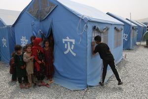 (250817) -- KABUL, 17 agosto, 2025 (Xinhua) -- Niños afganos permanecen frente a una tienda de campaña donada por China en un campamento de refugiados, en Kabul, Afganistán, el 17 de agosto de 2025. En todo Afganistán, las historias de los retornados y de los estudiantes por igual pintan un cuadro de resiliencia y renovación, un proceso fortalecido por la oportuna ayuda humanitaria de China y la cooperación educativa de gran alcance. (Xinhua/Saifurahman Safi) (oa) (ah)