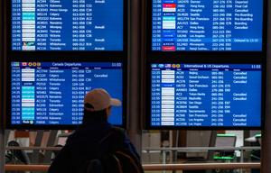 (250817) -- RICHMOND, 17 agosto, 2025 (Xinhua) -- Imagen del 16 de agosto de 2025 de los vuelos de Air Canada mostrados como cancelados en un tablero de información de vuelos, en el Aeropuerto Internacional de Vancouver, en Richmond, Columbia Británica, Canadá. La aerolínea más grande de Canadá dijo el sábado que suspendió todas las operaciones de Air Canada y Air Canada Rouge debido a una huelga de sus 10.000 asistentes de vuelo. Aproximadamente 130.000 clientes serán afectados cada día que la huelga continúe, dijo la aerolínea. (Xinhua/Liang Sen) (rtg) (ah)