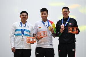 (250817) -- CHENGDU, 17 agosto, 2025 (Xinhua) -- El medallista de oro, Conrrado Kevin Moscoso Ortiz (c), de Bolivia, el medallista de plata, Diego García Quispe (i), de Argentina, y el medallista de bronce, Eduardo Portillo Torres, de México, posan durante la ceremonia de premiación del partido por la medalla de oro de individuales masculinos de ráquetbol en los Juegos Mundiales 2025, en Chengdu, en la provincia de Sichuan, en el suroeste de China, el 17 de agosto de 2025. (Xinhua/Du Zixuan) (oa) (ah)
