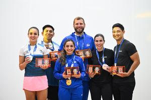(250817) -- CHENGDU, 17 agosto, 2025 (Xinhua) -- Los medallistas de oro, Jacob Bredenbeck (3-d)/Naomi Ros (3-i), de Estados Unidos, los medallistas de plata, Diego García Quispe (2-i)/María José Vargas Parada (i), de Argentina, y los medallistas de bronce, Coby Evan Iwaasa (d)/Frederique Lambert, de Canadá, posan durante la ceremonia de premiación del partido por la medalla de oro de dobles mixtos de ráquetbol en los Juegos Mundiales 2025, en Chengdu, en la provincia de Sichuan, en el suroeste de China, el 17 de agosto de 2025. (Xinhua/Du Zixuan) (oa) (ah)