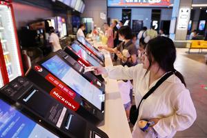 (250817) -- NANJING, 17 agosto, 2025 (Xinhua) -- Ciudadanos toman sus boletos en un cine, en Jiaxing, en la provincia de Zhejiang, en el este de China, el 17 de agosto de 2025. El mercado cinematográfico ha experimentado un gran auge este fin de semana mientras varias películas de moda se estrenaron durante las vacaciones de verano. (Xinhua/Jin Peng) (rtg) (ah)