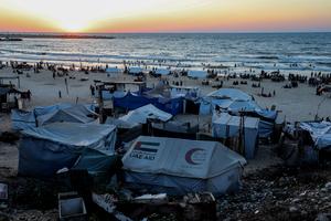 (250819) -- CIUDAD DE GAZA, 18 agosto, 2025 (Xinhua) -- Imagen del 18 de agosto de 2025 de palestinos desplazados vistos entre tiendas de campaña improvisadas cerca de la playa en el oeste de la Ciudad de Gaza. Un funcionario israelí que solicitó permanecer anónimo dijo el lunes a Xinhua que Israel recibió la respuesta de Hamas a la propuesta de cese al fuego en Gaza que incluye cláusulas sobre la liberación de rehenes, pero que aún no se ha emitido ninguna respuesta formal. (Xinhua/Rizek Abdeljawad) (jg) (ra) (vf)
