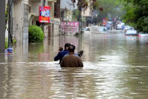 (250819) -- KARACHI, 19 agosto, 2025 (Xinhua) -- Personas vadean a través de una calle inundada tras las fuertes lluvias...