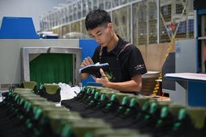 (250819) -- PUTIAN, 19 agosto, 2025 (Xinhua) -- Un empleado trabaja en el taller inteligente de una empresa de calzado,...