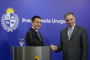 (250819) -- MONTEVIDEO, 19 agosto, 2025 (Xinhua) -- El presidente uruguayo, Yamandú Orsi (d), estrecha la mano del presidente ecuatoriano,...