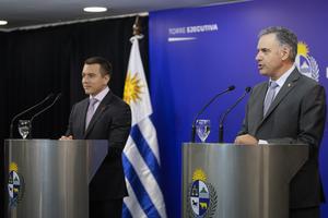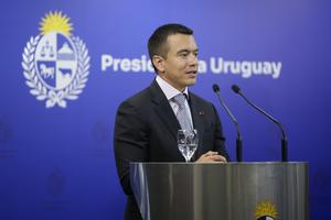 (250819) -- MONTEVIDEO, 19 agosto, 2025 (Xinhua) -- El presidente ecuatoriano, Daniel Noboa, habla durante una conferencia de prensa conjunta...