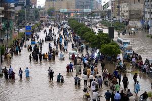 (250819) -- KARACHI, 19 agosto, 2025 (Xinhua) -- Personas vadean a través de una calle inundada tras las fuertes lluvias...