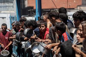 (250819) -- GAZA, 19 agosto, 2025 (Xinhua) -- Imagen del 18 de agosto de 2025 de palestinos desplazados esperando para...