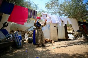 (250819) -- BEIRUT, 19 agosto, 2025 (Xinhua) -- Imagen del 14 de agosto de 2025 de una mujer siria desplazada...