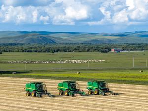 (250820) -- HULUN BUIR, 20 agosto, 2025 (Xinhua) -- Agricultores conducen cosechadoras para cargar trigo recién cosechado en una granja,...