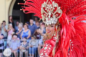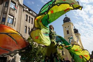 (250820) -- DEBRECEN, 20 agosto, 2025 (Xinhua) -- Una juerguista asiste a un desfile durante el Carnaval de las Flores...