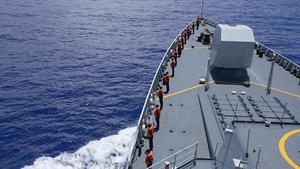 (250820) -- A BORDO DEL DESTRUCTOR SHAOXING, 20 agosto, 2025 (Xinhua) -- Marineros chinos permanecen en cubierta durante una ceremonia...
