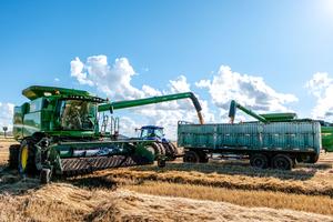 (250820) -- HULUN BUIR, 20 agosto, 2025 (Xinhua) -- Agricultores conducen cosechadoras para cargar trigo recién cosechado en una granja,...