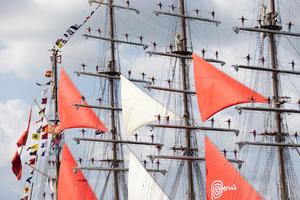 (250820) -- AMSTERDAM, 20 agosto, 2025 (Xinhua) -- Marineros en los mástiles de un velero navegan hacia Amsterdam, Países Bajos,...