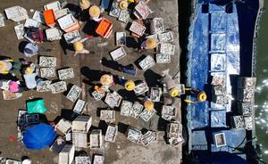 (250821) -- WENCHANG, 21 agosto, 2025 (Xinhua) -- Imagen tomada con un dron de capturas de pescado siendo descargadas y...