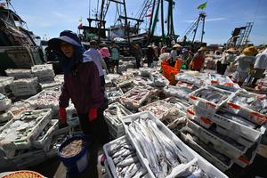 (250821) -- WENCHANG, 21 agosto, 2025 (Xinhua) -- Capturas de pescado son descargadas y comercializadas en un puerto pesquero, en...
