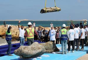 (250821) -- ALEJANDRIA, 21 agosto, 2025 (Xinhua) -- Un artefacto es recuperado del Mar Mediterráneo, en la bahía de Abu...