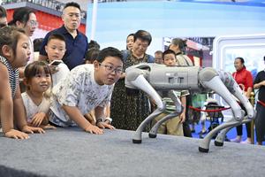 (250821) -- TAIYUAN, 21 agosto, 2025 (Xinhua) -- Niños interactúan con un perro robot en la 7 Feria de Industrias...
