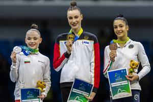 (250823) -- RÍO DE JANEIRO, 23 agosto, 2025 (Xinhua) -- Imagen del 22 de agosto de 2025 de la medallista de oro Darja Varfolomeev (c), de Alemania, la medallista de plata Stiliana Nikolova (i), de Bulgaria, y la medallista de bronce Sofia Raffaeli, de Italia, posando con sus medallas para una fotografía durante la ceremonia de premiación de las finales del concurso completo individual durante el 41 Campeonato Mundial de Gimnasia Rítmica de la FIG, en Río de Janeiro, Brasil. (Xinhua/Claudia Martini) (oa) (da)