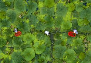 (250822) -- BEIJING, 22 agosto, 2025 (Xinhua) -- Vista aérea tomada con un dron el 22 de agosto de 2025 de agricultores cosechando semillas de Gordon Euryale, en la aldea de Huisheng del poblado de Dongxing de la ciudad de Jingjiang, en la provincia de Jiangsu, en el este de China. A medida que se acerca el Chushu de los términos solares, los agricultores de todo el país están ocupados trabajando en el campo. (Xinhua/Tang Dehong) (oa) (ra) (ce)