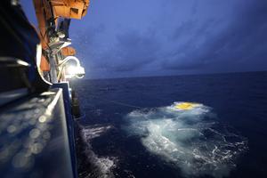 (250824) -- A BORDO DEL BUQUE ZHONG SHAN DA XUE, 24 agosto, 2025 (Xinhua) -- Imagen del 23 de agosto de 2025 del vehículo submarino chino operado por control remoto (ROV, por sus siglas en inglés) Haiqin, con capacidad de descender hasta 6.000 metros, es recuperado del mar, en el Mar Meridional de China.El sistema ROV eléctrico de aguas profundas, con capacidad de descender hasta 6.000 metros, completó con éxito un viaje a aguas profundas en el Mar Meridional de China, informaron científicos a la Agencia de Noticias Xinhua. El sistema ROV eléctrico de aguas profundas nombrado Haiqin, que fue diseñado y construido por la Universidad Jiao Tong de Shanghai, alcanzó una profundidad de 4.140 metros, como parte de su reciente prueba en el mar, llevada a cabo durante la madrugada del sábado. Equipado con cámaras de alta definición, brazos robóticos, sistemas de sonar y sensores, el vehículo demostró capacidades que incluyen control automático de rumbo y navegación estacionaria precisa. (Xinhua/Zhang Jiansong) (rtg) (da)