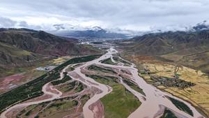 (250824) -- YUSHU, 24 agosto, 2025 (Xinhua) -- Vista aérea tomada con un dron el 22 de agosto de 2025 del río Zaqu en otoño, en el distrito de Nangqian, en la prefectura autónoma tibetana de Yushu, en la provincia de Qinghai, en el noroeste de China. (Xinhua/Qi Zhiyue) (oa) (ah)