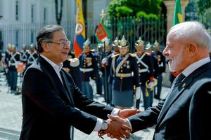 (250822) -- BOGOTA, 22 agosto, 2025 (Xinhua) -- Imagen proveída por el Palacio del Planalto del presidente colombiano, Gustavo Petro (i), estrechando la mano del presidente de Brasil, Luiz Inácio Lula da Silva (d), durante la cumbre presidencial de la Organización del Tratado de Cooperación Amazónica (OTCA), en Bogotá, capital de Colombia, el 22 de agosto de 2025. Los presidentes de Brasil, Luiz Inácio Lula da Silva, y de Colombia, Gustavo Petro, anunciaron medidas conjuntas para hacer frente al narcotráfico y otras economías ilegales que amenazan la región amazónica, en el marco de la cumbre presidencial de la OTCA que se celebró el viernes en Bogotá, la capital colombiana. (Xinhua/Ricardo Stuckert/Palacio del Planalto) (jg) (da) (ce)