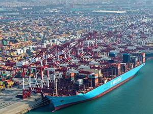 (250819) -- QINGDAO, Aug. 19, 2025 (Xinhua) -- An aerial drone photo taken on Aug. 19, 2025 shows a cargo ship at Qingdao Port in Qingdao, east China's Shandong Province. As of the end of July, Qingdao Port has added 22 new outbound trade routes this year, bringing its total to 233 and connecting to over 700 ports in more than 180 countries and regions. (Xinhua/Li Ziheng)