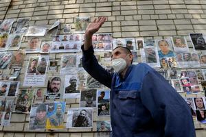 (250613) -- KIEV, 13 junio, 2025 (Xinhua) -- Imagen del 12 de junio de 2025 de un prisionero de guerra ucraniano liberado saludando a las personas mientras camina junto a una pared cubierta con imágenes de soldados ucranianos desaparecidos en un centro de asistencia médica. Ucrania y Rusia llevaron a cabo el jueves la segunda fase de un intercambio de prisioneros gravemente enfermos y severamente heridos, dijeron las autoridades ucranianas. (Xinhua/Peter Druk) (jg) (da) (ce)