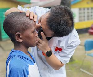 (250822) -- FREETOWN, 22 agosto, 2025 (Xinhua) -- Imagen del 16 de junio de 2025 de un miembro del 26 grupo del equipo médico chino en Sierra Leona realizando exámenes del fondo de ojo para un huérfano local en el Instituto de Bienestar Infantil de la Fundación Saint George, en Freetown, Sierra Leona. El equipo médico ha completado más de 10.000 tratamientos médicos desde su llegada, incluyendo casi 100 operaciones quirúrgicas muy difíciles y más de 100 rescates de emergencia. Los tipos de cirugías que realizan abarcan diversas áreas, como cirugía general, ortopedia, ginecología y obstetricia. Su amplia experiencia les permite abordar diversos desafíos médicos. (Xinhua/El 26 grupo del equipo médico chino en Sierra Leona) (rtg) (ra)