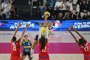 (250826) -- CHIANG MAI, 26 agosto, 2025 (Xinhua) -- Gabriela Braga Guimaraes (arriba), de Brasil, clava el balón durante el...