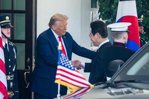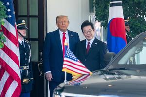 (250825) -- WASHINGTON, 25 agosto, 2025 (Xinhua) -- El presidente estadounidense, Donald Trump (2-i), recibe al visitante presidente surcoreano, Lee...
