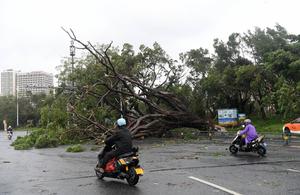 (250825) -- SANYA, 25 agosto, 2025 (Xinhua) -- Ciudadanos circulan frente a árboles caídos, en Sanya, en la provincia de...